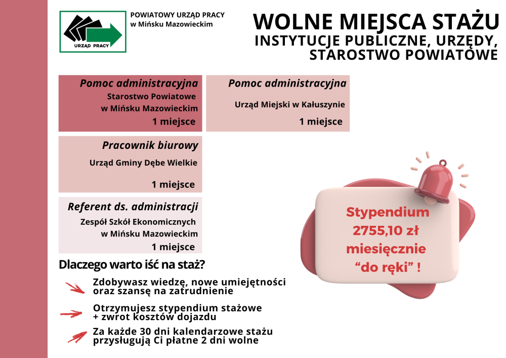 Zgłoś się do Powiatowego Urzędu Pracy w Mińsku Mazowieckim - pokój 105, po skierowanie na staż.